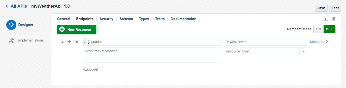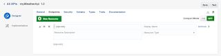 We need to create an Endpoint we click on New Resource and add {zipcode}. This is the parameter that our API will need to send it to the connector call.