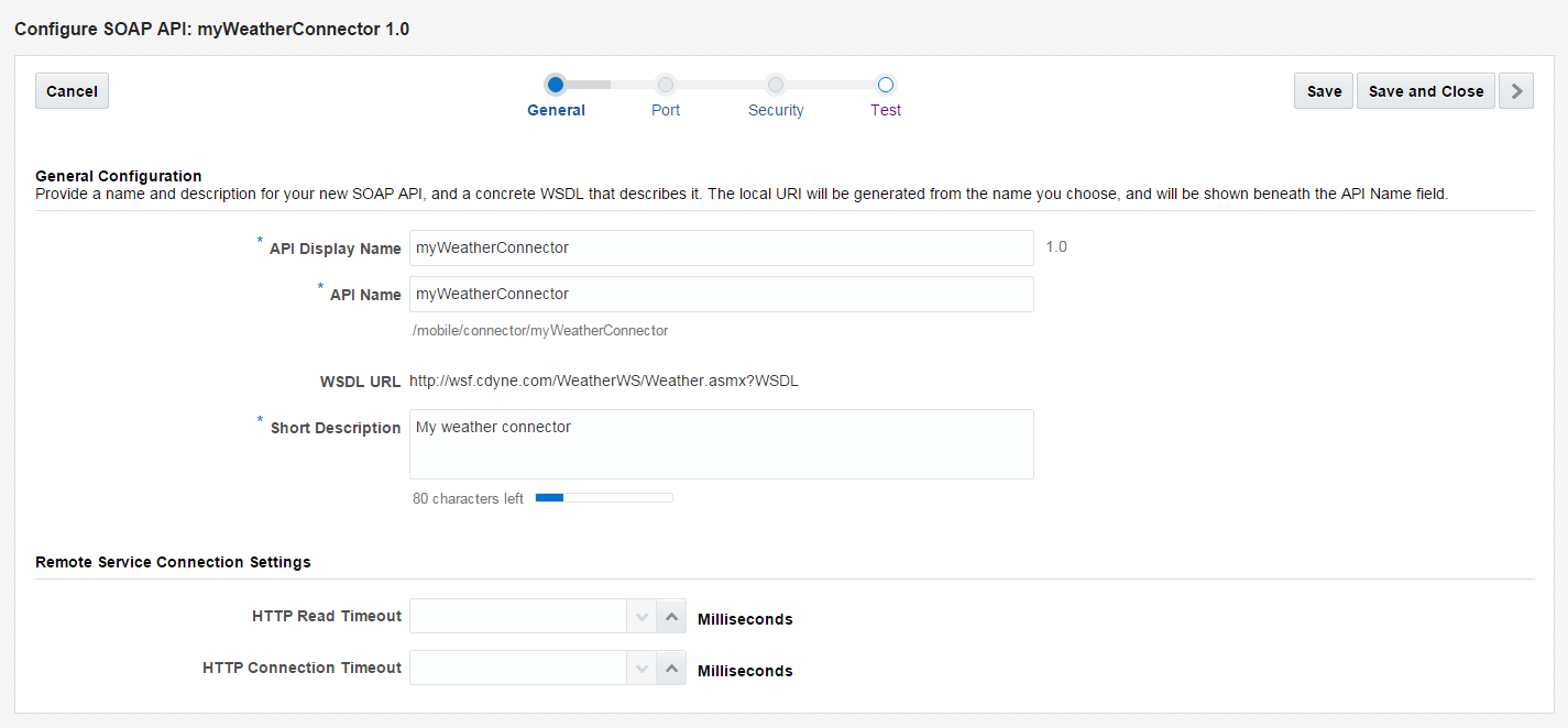 Our connector has been created. Now we can configure settings like connection timeout or add security policies.