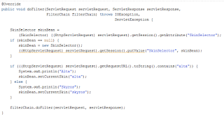 The next step is to create a filter. In doFilter we are going to evaluate the URL and set the skin based on that value. We also have to instantiate the bean and add it to sessionScope becasuse the first time it will be null.