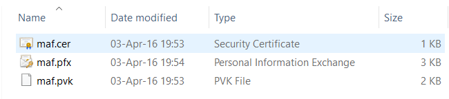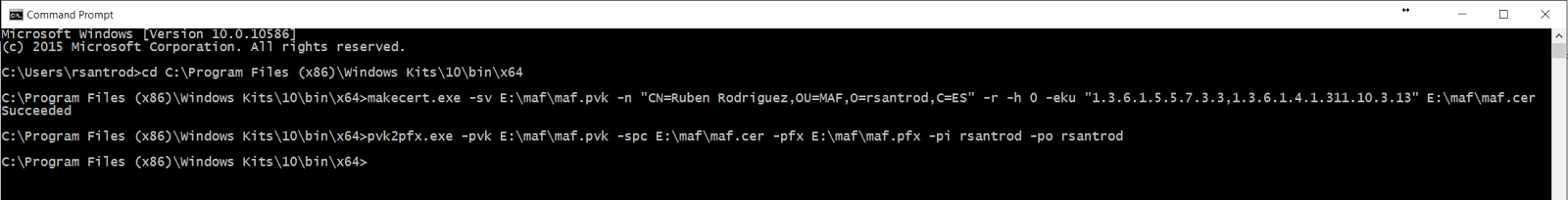 makecert.exe -sv E:mafmaf.pvk -n “CN=Ruben Rodriguez,OU=MAF,O=rsantrod,C=ES” -r -h 0 -eku “1.3.6.1.5.5.7.3.3,1.3.6.1.4.1.311.10.3.13” E:mafmaf.cer