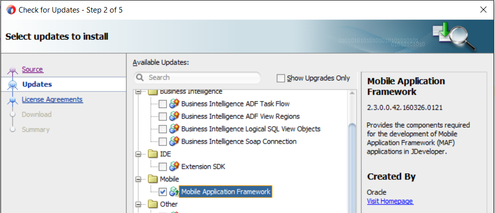 Once we have installed JDeveloper, we have to install Oracle Mobile Application Framework extension.