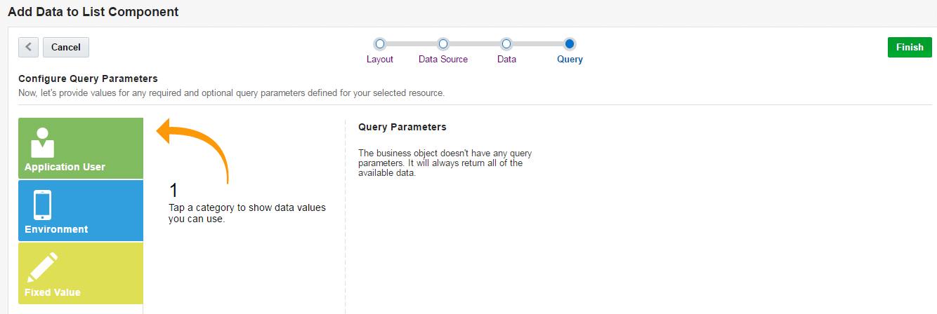 After associating the data to a component, we will see a menu on the left where we can choose user, evironment information, or setting a fixed value to set as query parameter if the endpoint we are consuming has a parameter,