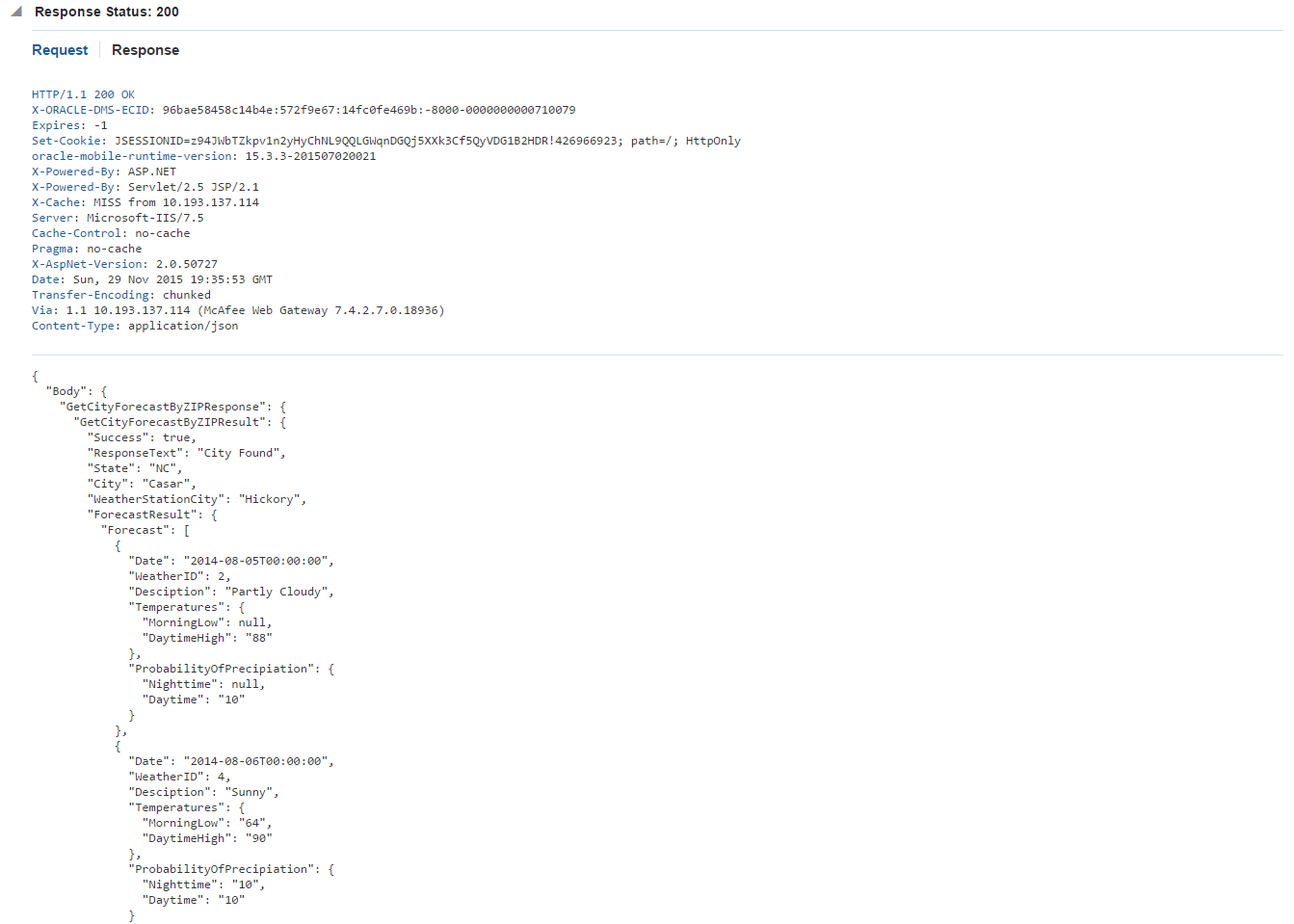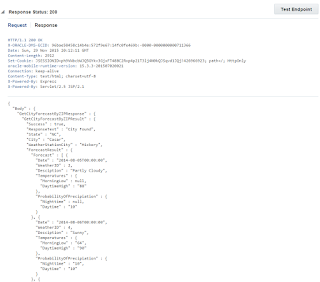 The last step is to test out API. Just type a zip code, select the MBE and version and click on Test Endpoint. You will see that the API works and returns us the weather forecast.