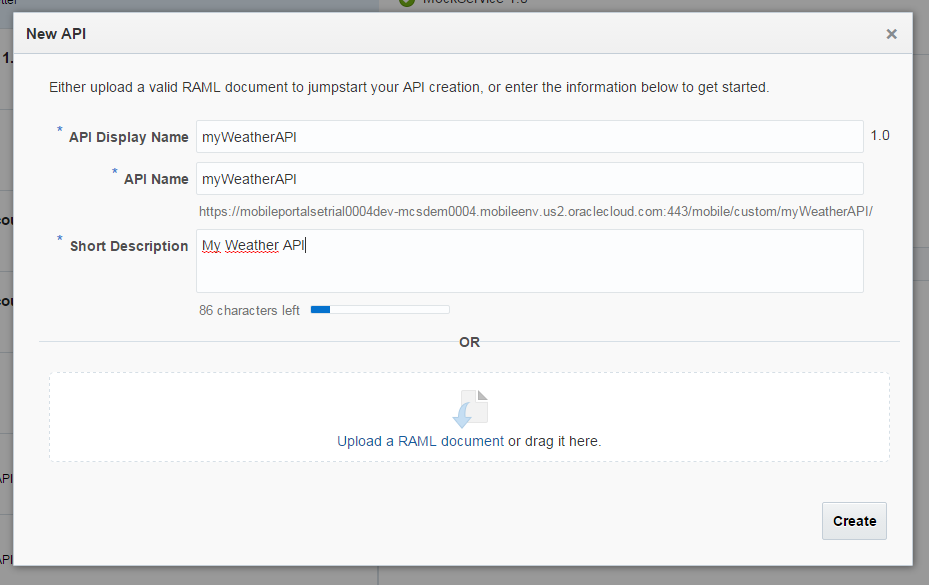 In the popup we have to fill the name of the API and a short description or upload a RAML file.