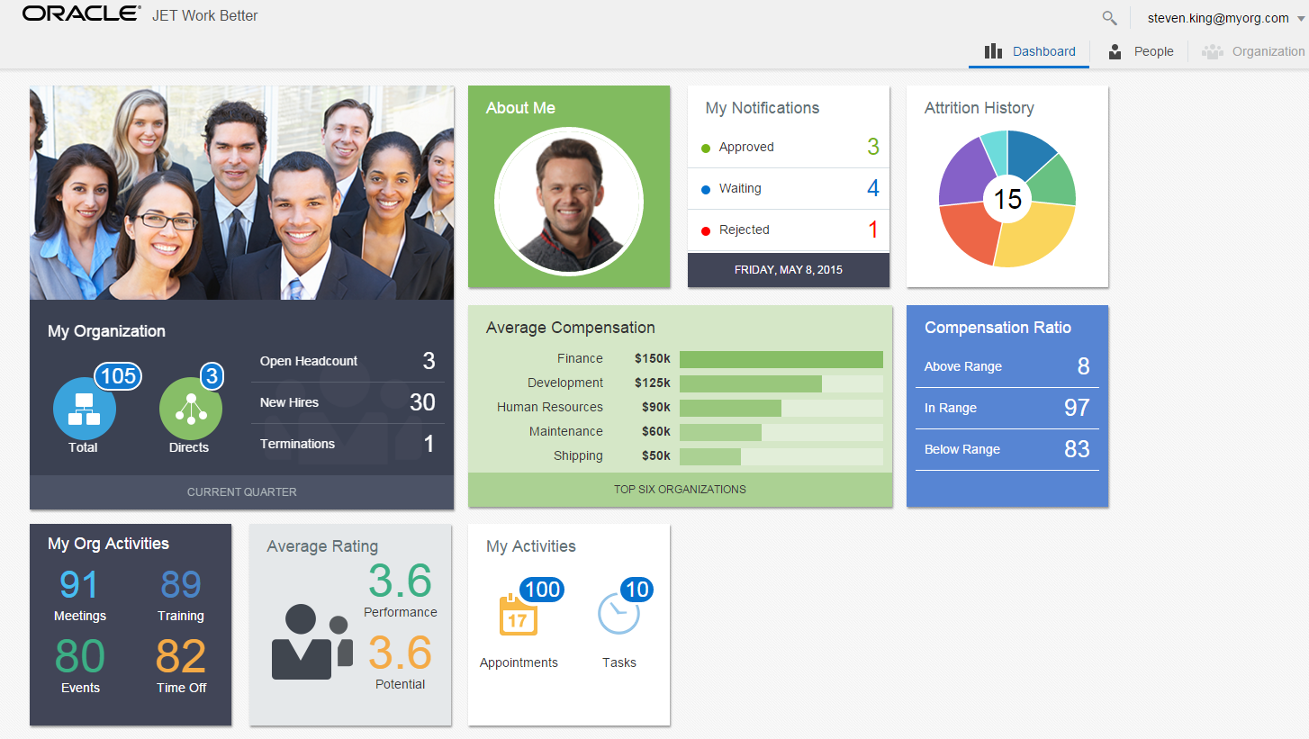 Oracle JET supports MVVM arquitecture pattern (Model-View-ViewModel). In this architecture the Model represents the application data, the View is the presentation of the data and the ViewModel exposes the data from the model to the View.